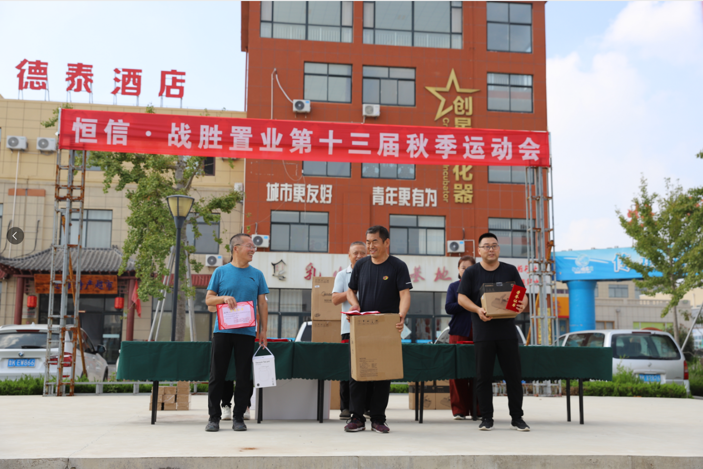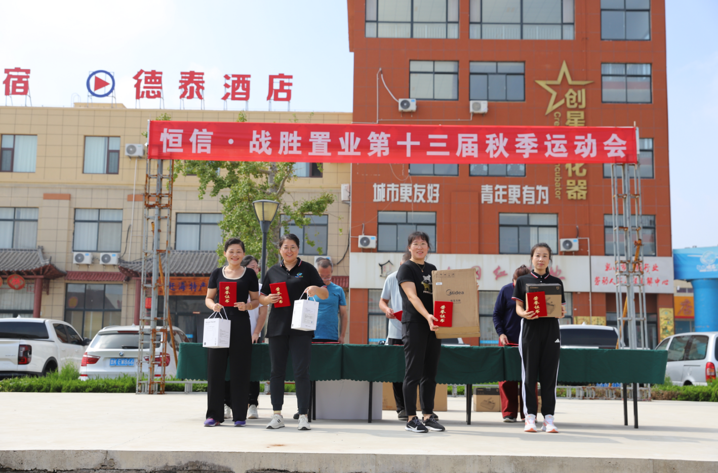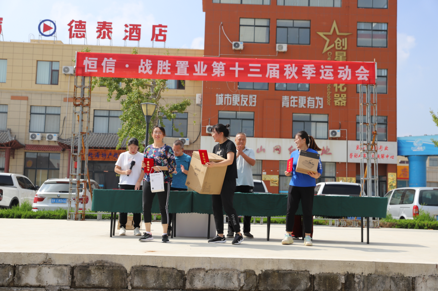 运动会闭幕式上,恒信·战胜置业刘战胜刘总、马风兰马总、宋波宋经理、刘彦君刘经理一起为获奖的运动员以及获奖团队颁奖。